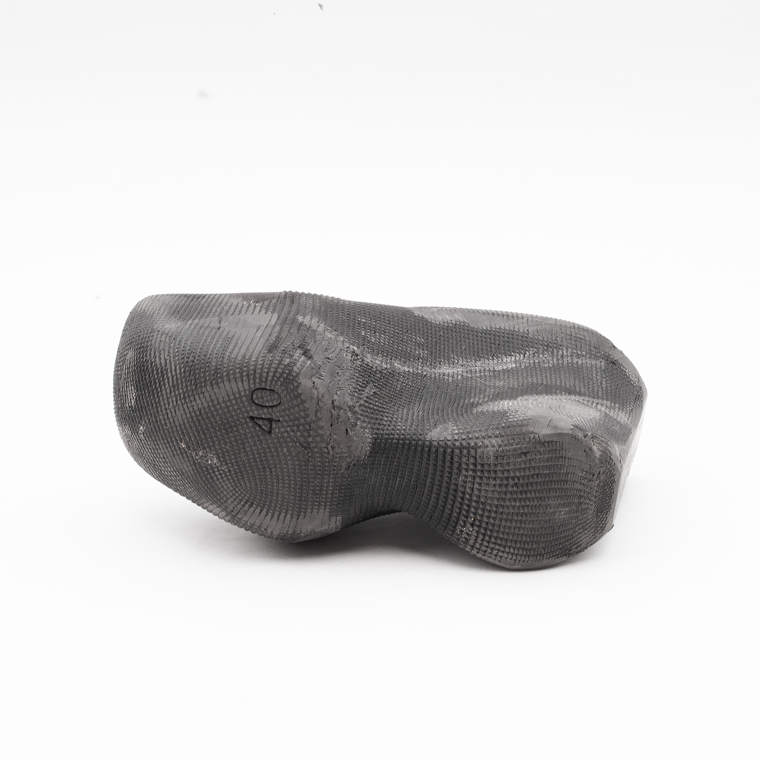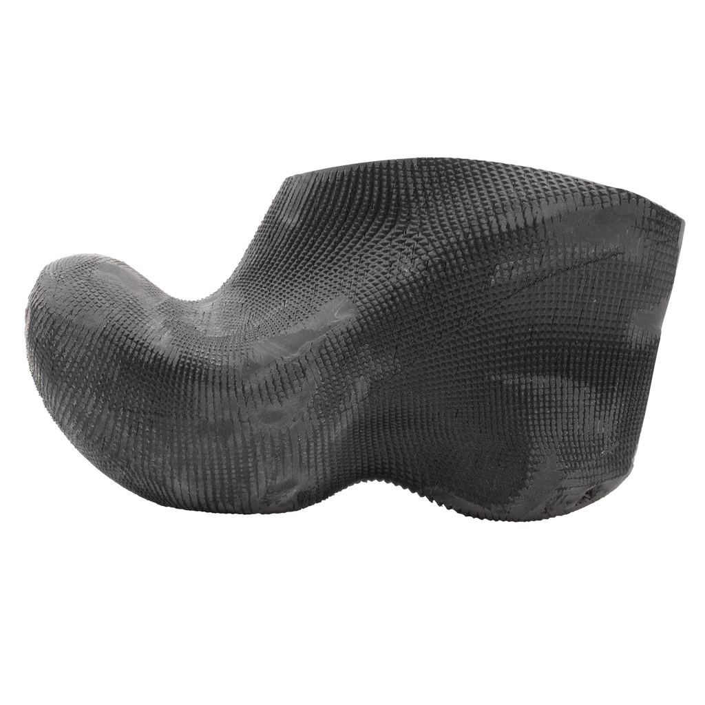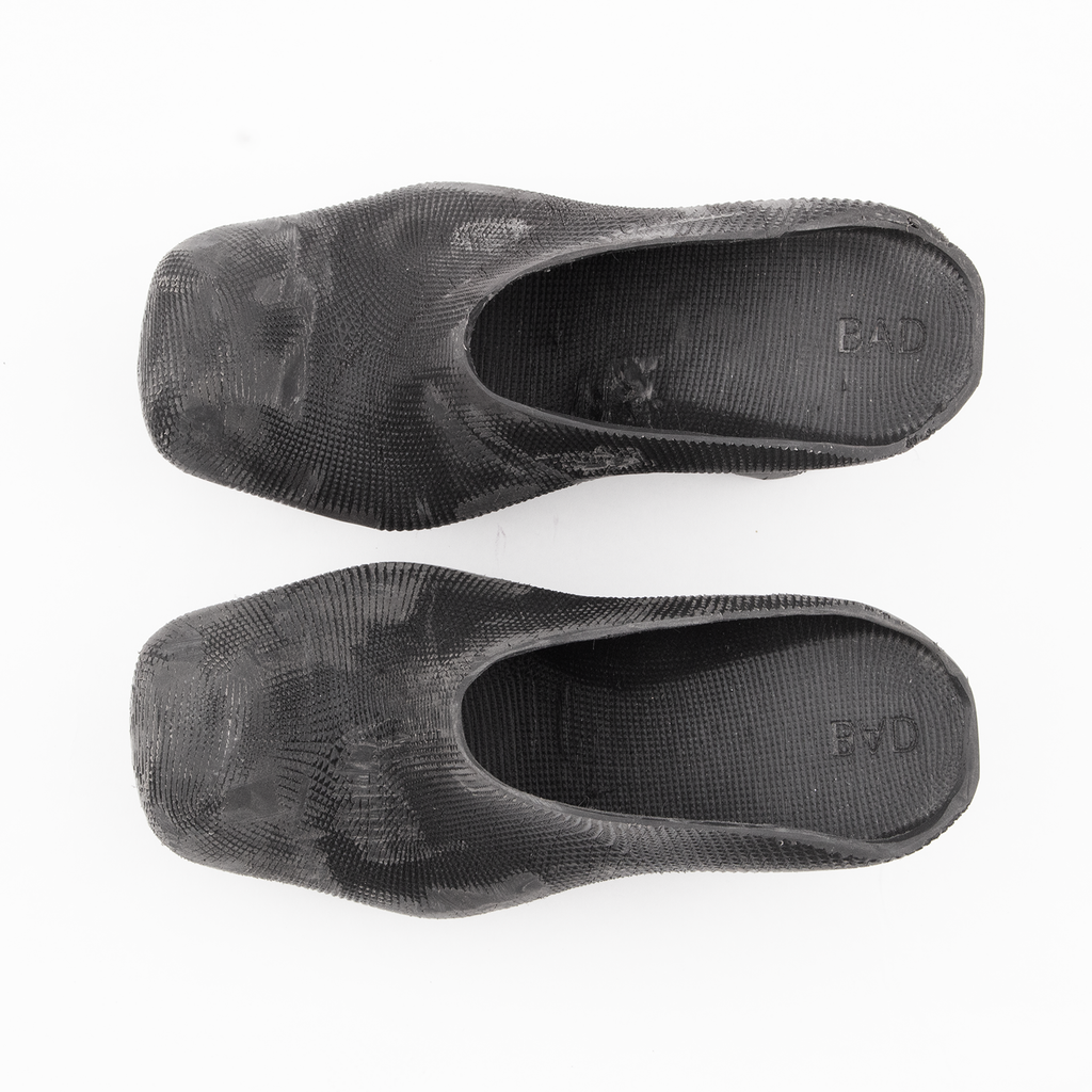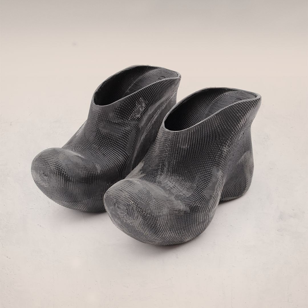3D-printed heeled rubber mules. These mules are crafted entirely from a fully recyclable, highly flexible polyurethane rubber. They are sanded post-printing to contribute towards a worn-out aesthetic. Compared to traditional injection molding, 3D printing minimizes material waste while maintaining structural integrity. Minor surface imperfections are inherent to the printing process and contribute to the product’s aesthetic without affecting functionality.