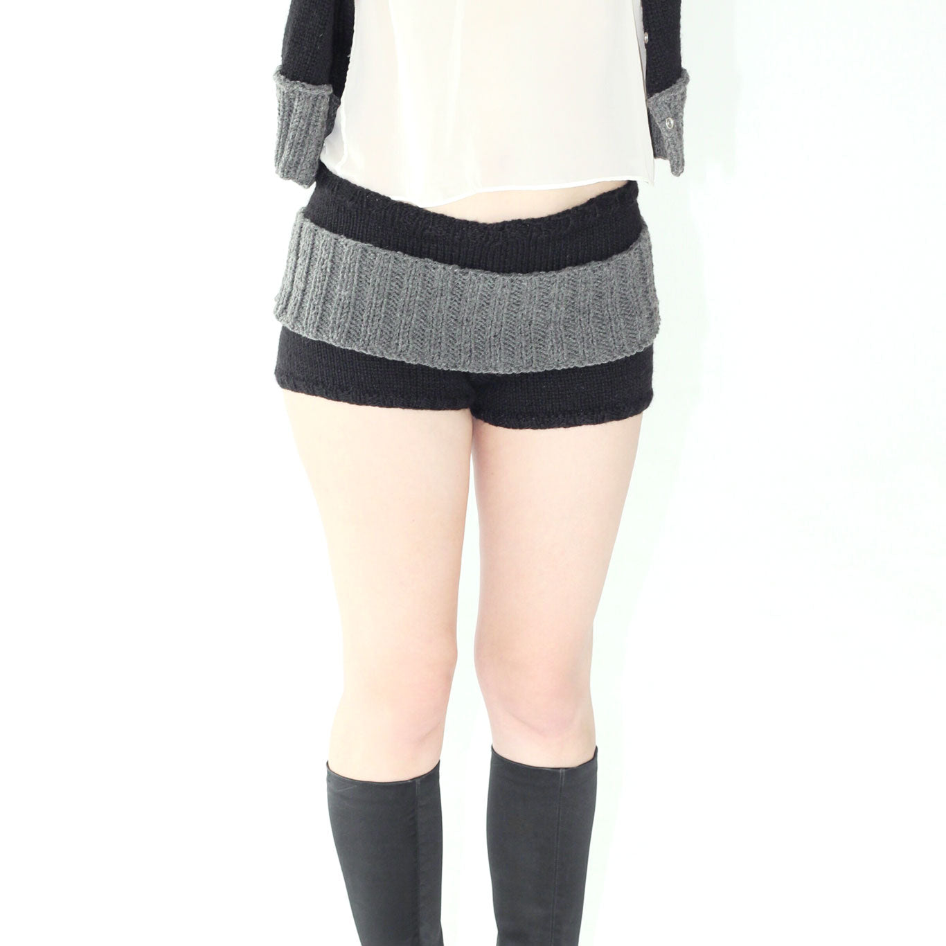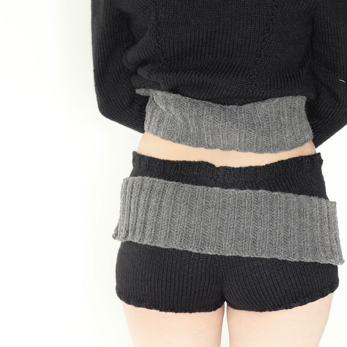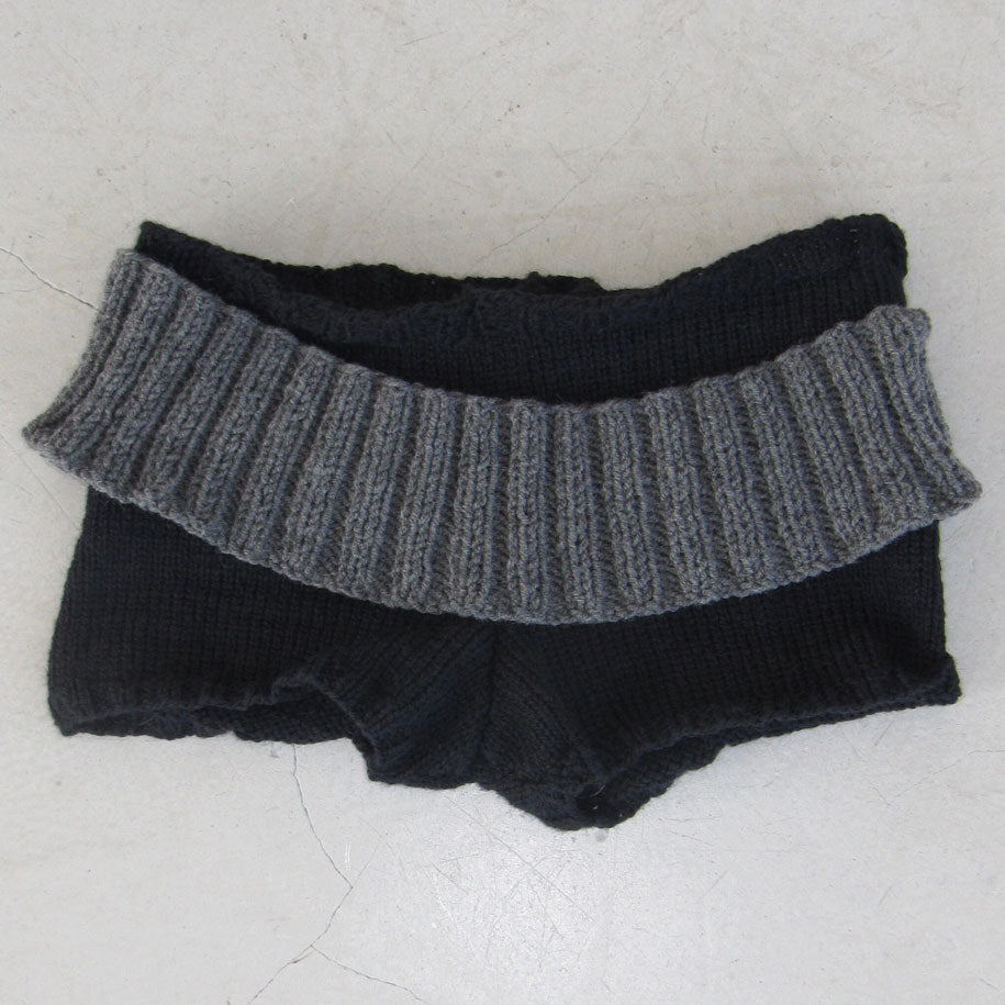 Stretchy black knit shorts crafted from a wool and acrylic blend. Features a handcrafted grey belt with snap buttons and a removable, flexible styling detail. Handle gently during wear and care-snap fasteners may be tight when new, and pilling can be managed with a fabric shaver.