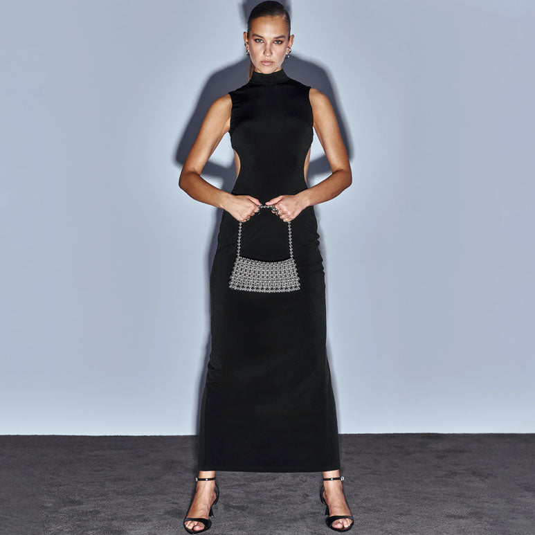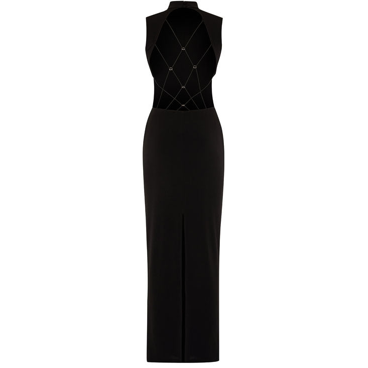 The No Strings Attached jersey maxi redefines the high neck silhouette with an unapologetically bare back laced in criss cross straps. Sleek in the front, subversive from behind, it’s designed for nights when subtlety isn’t on the guest list. Finished with a floor-skimming cut and back slit for effortless movement, this piece is all about power, allure, and the drama of the reveal.