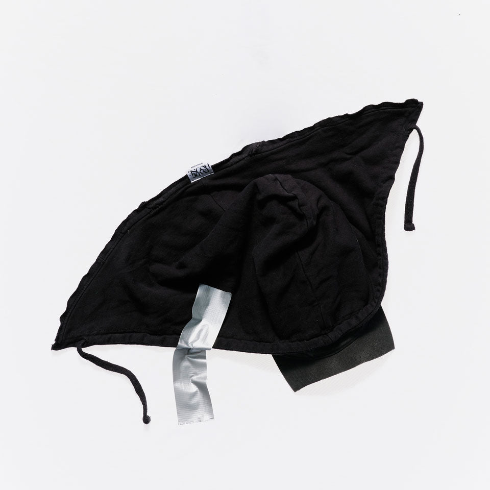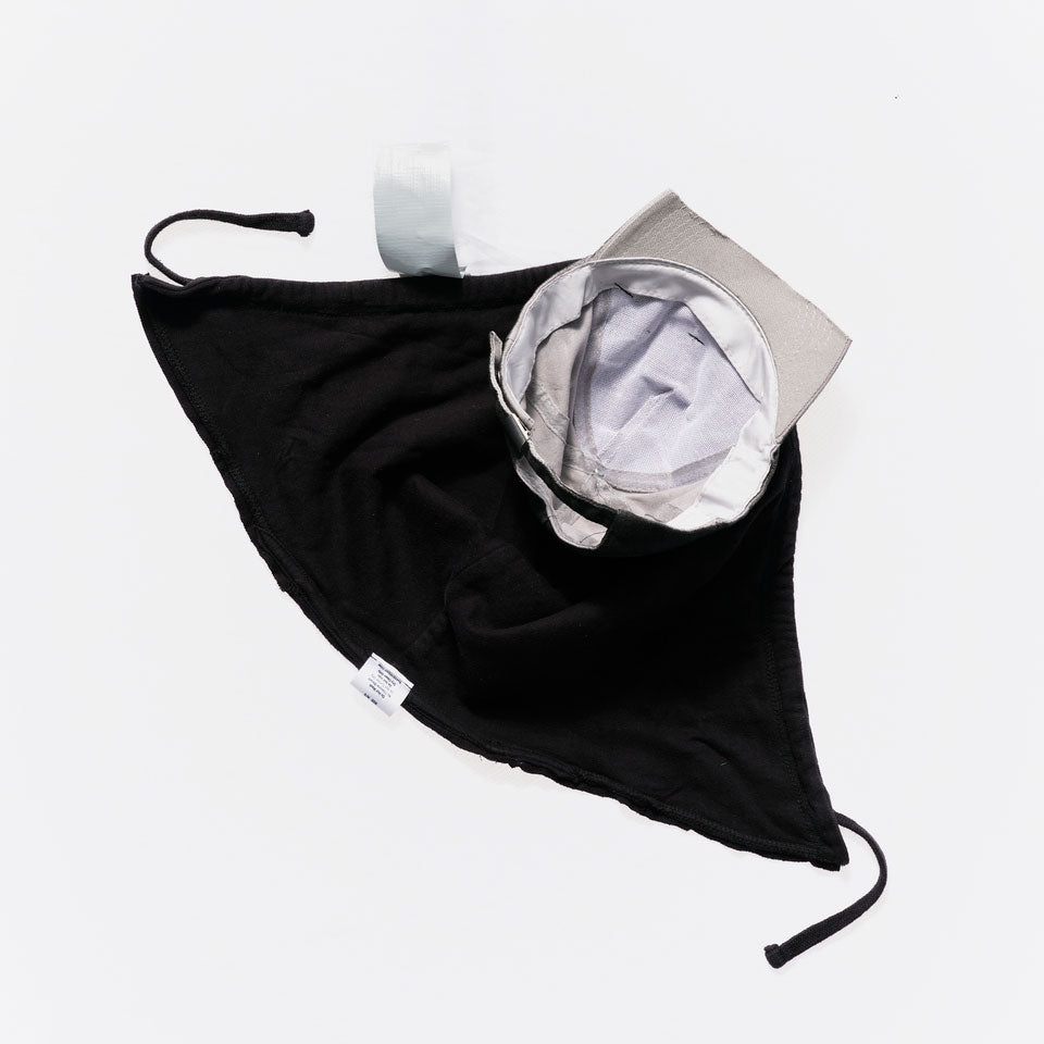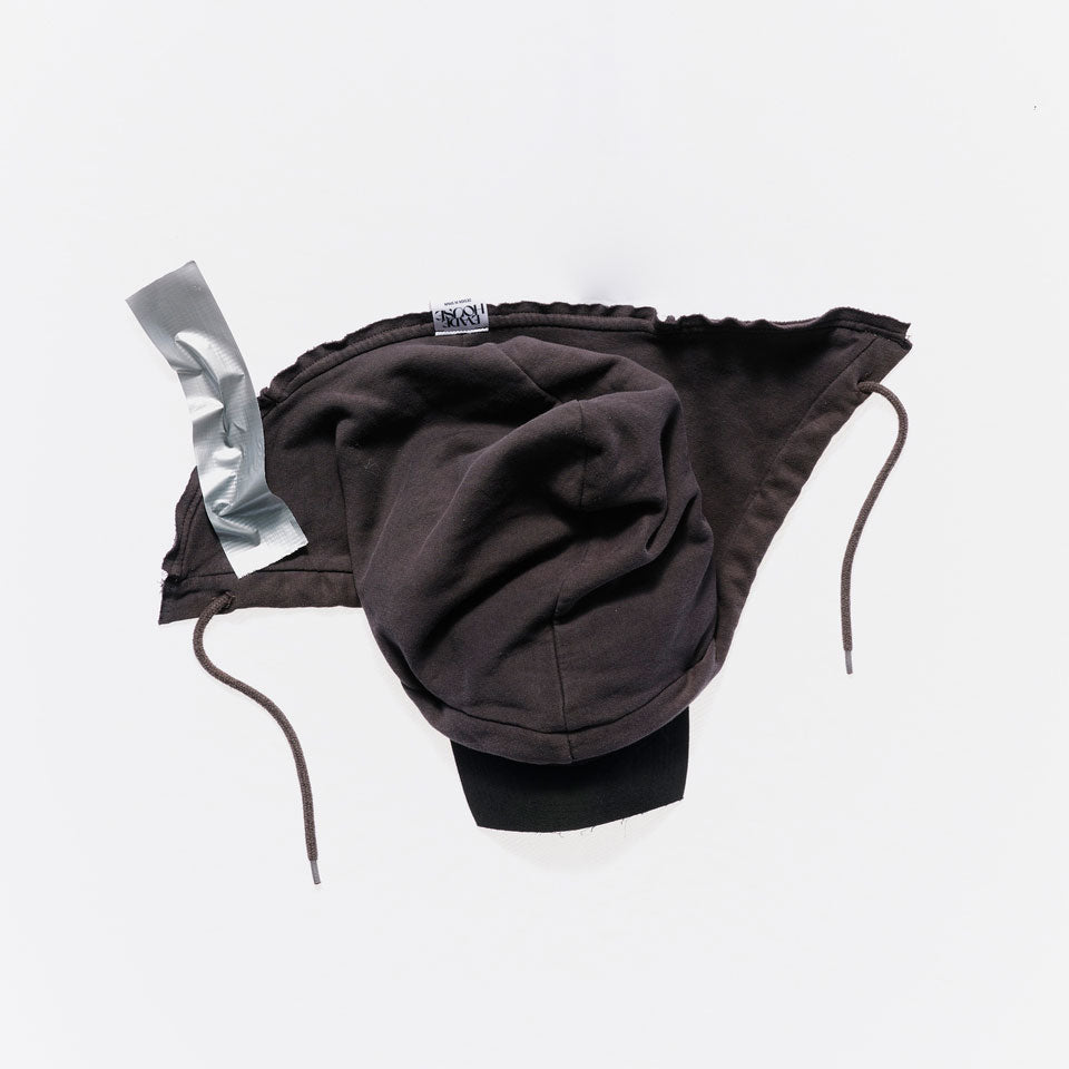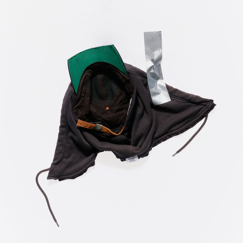 This cap is a unique up cycled design that combines a basic cap with a cut-off visor and a sweatshirt hood sewn over the top. The caps have been dyed black using spray, adding a raw and textured finish. Due to the nature of the up cycling process, each cap is slightly different, making every piece one of a kind.