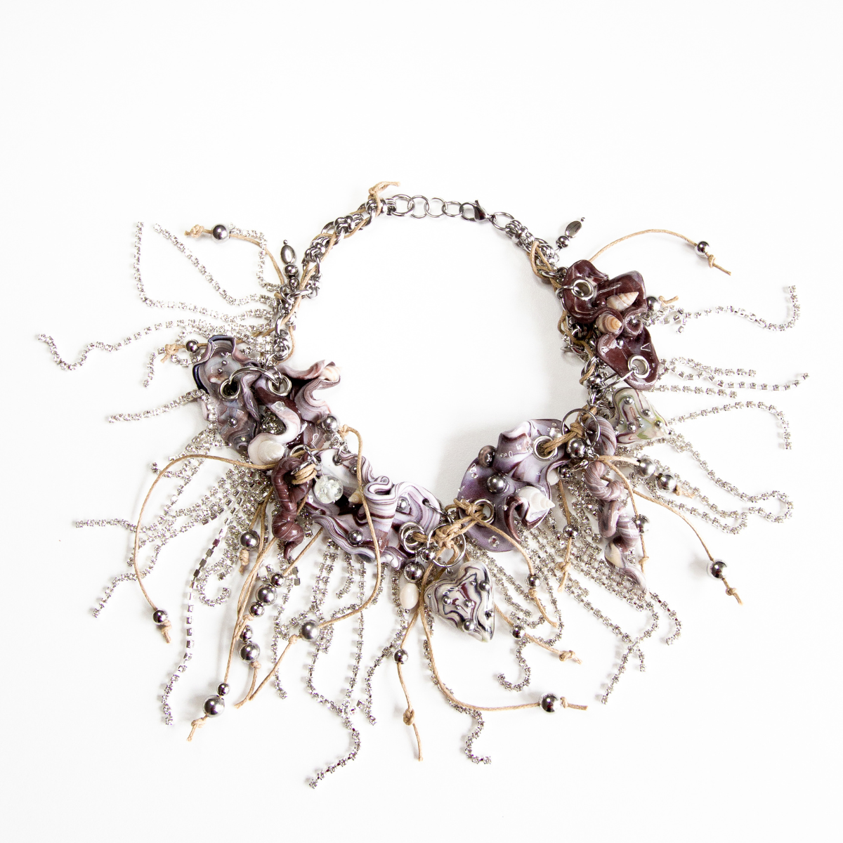 Clay, Stainless Steel, Waxed cotton cord, Plant based Resin, Glass beads, Repurposed Genuine Seashells.