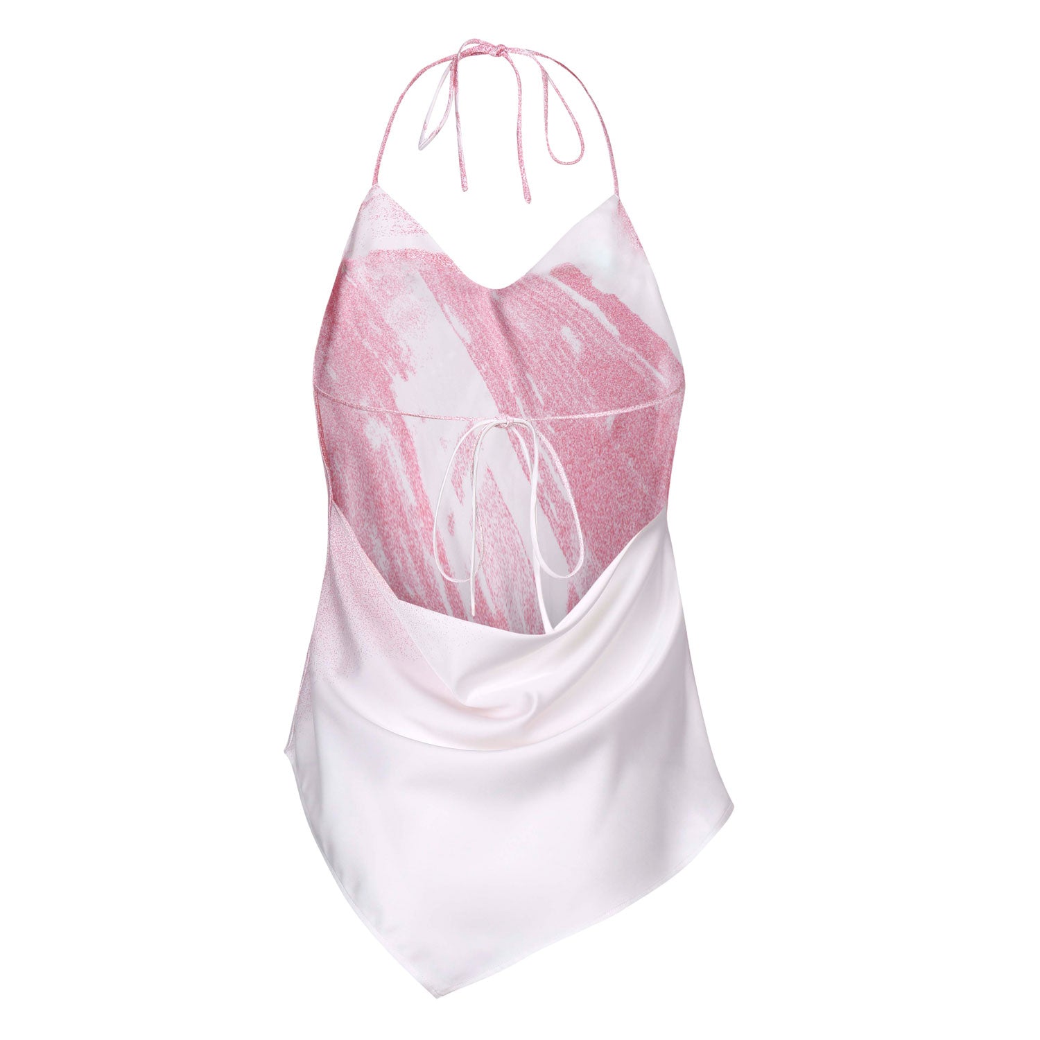 This top features a draped neckline and asymmetric hem, printed with a soft gradient pink water reflection motif. The airy silhouette flows effortlessly, enhanced by a fluid fabric with a subtle sheen. Designed with adjustable ties at the neck and back, it offers a flexible, barely-there fit ideal for warmer days or layering under outerwear.