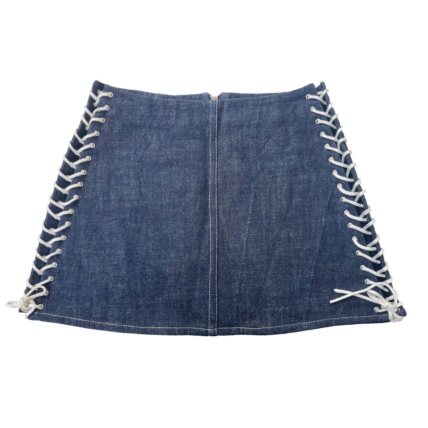 Mini skirt featuring removable spaghetti lace. Cut out at the front with corset drawstring. Crafted from up-cycled denim.