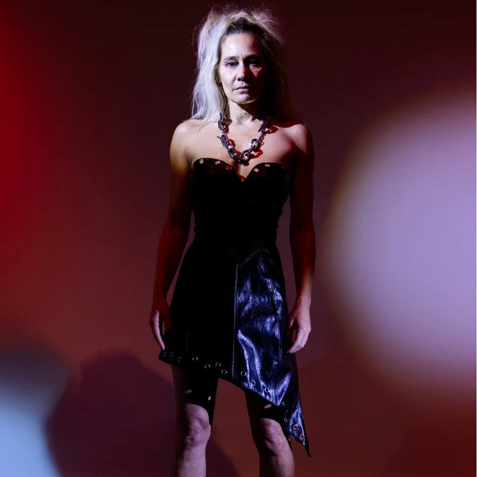 Mini dress in black imitation leather, with eyelet detail on garment (top and bottom). Asymmetrical bottom / point cut. Stitching on every seam. Back zip. Black lining. Yellow label, inside back