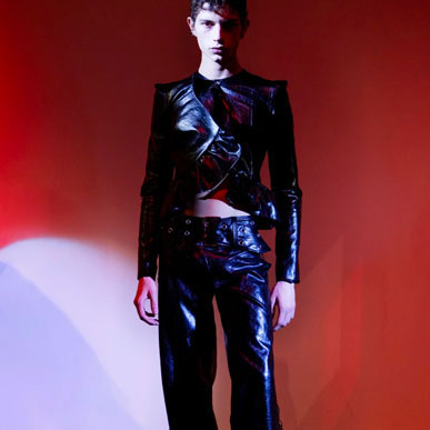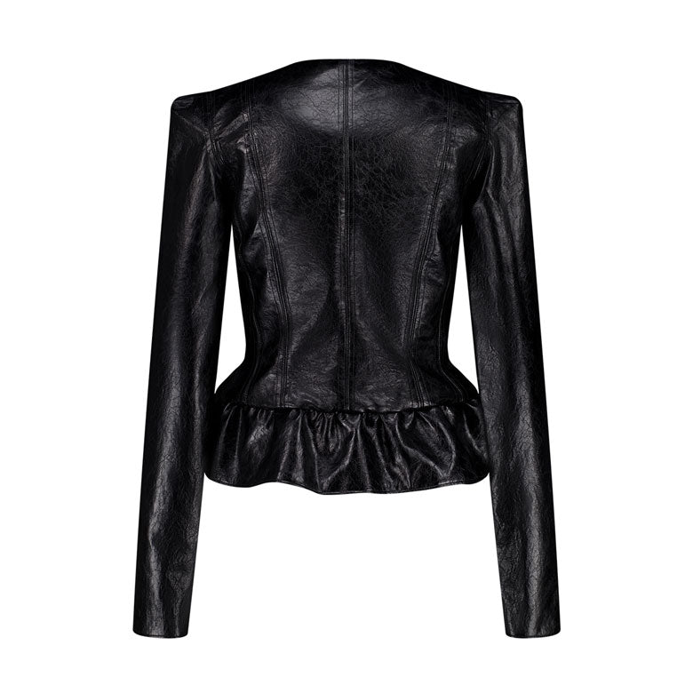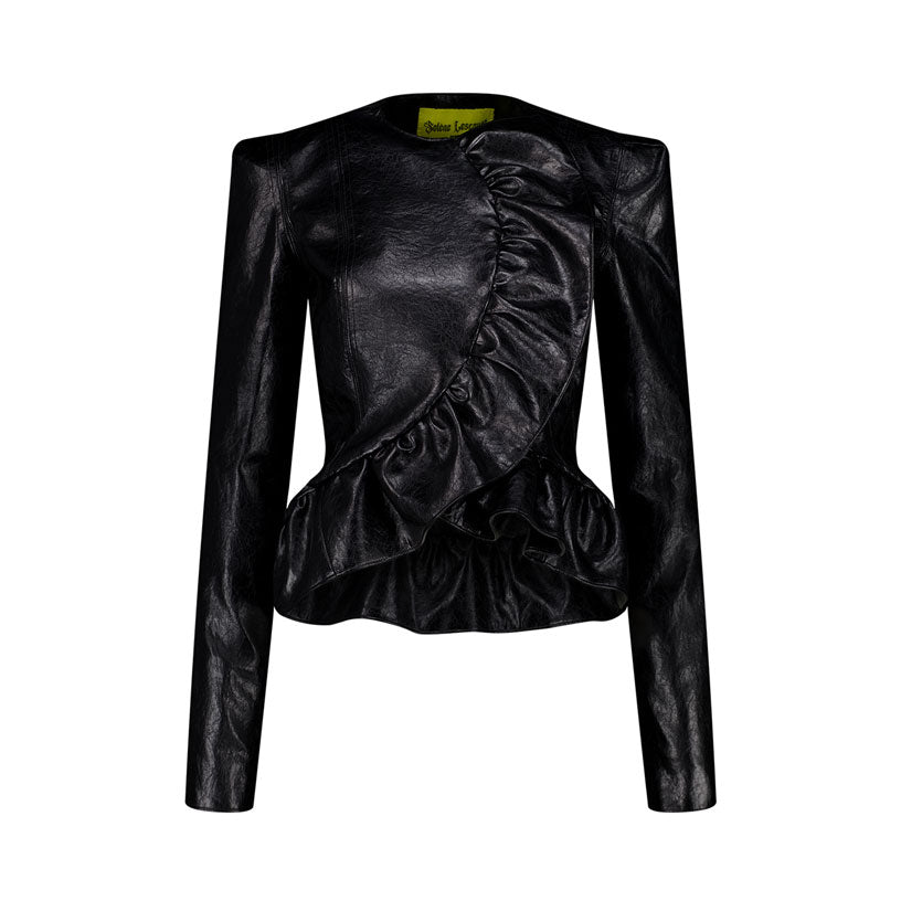 Pleated jacket in black imitation leather. Rows of pleats on the bottom of the garment and on the opening. Closed with two snap fasteners. Black lining. Yellow label, inside middle back