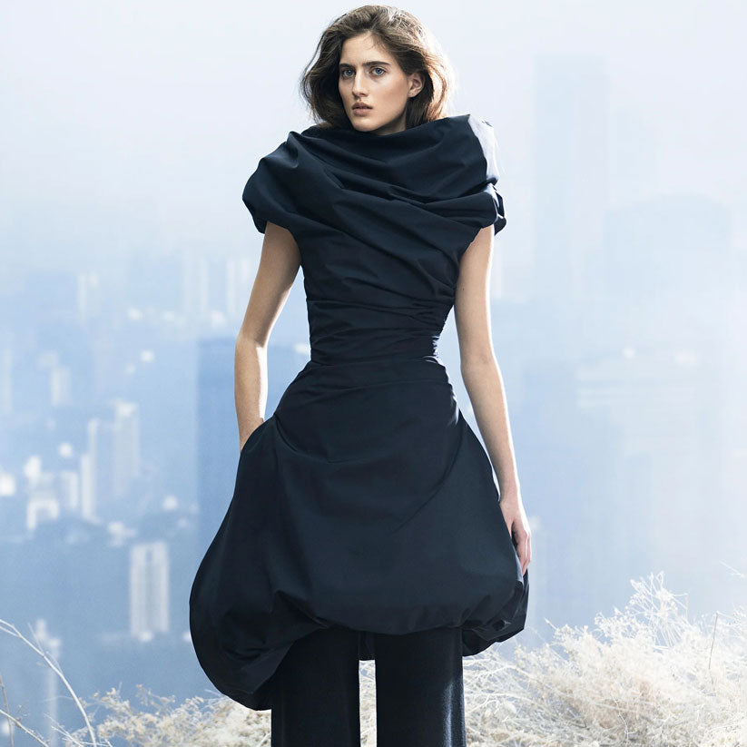 A voluminous dress crafted from technical fabric, structured with soft folds that create a sculptural silhouette. Playful yet architectural, it embodies elegance with a bold, modern twist.