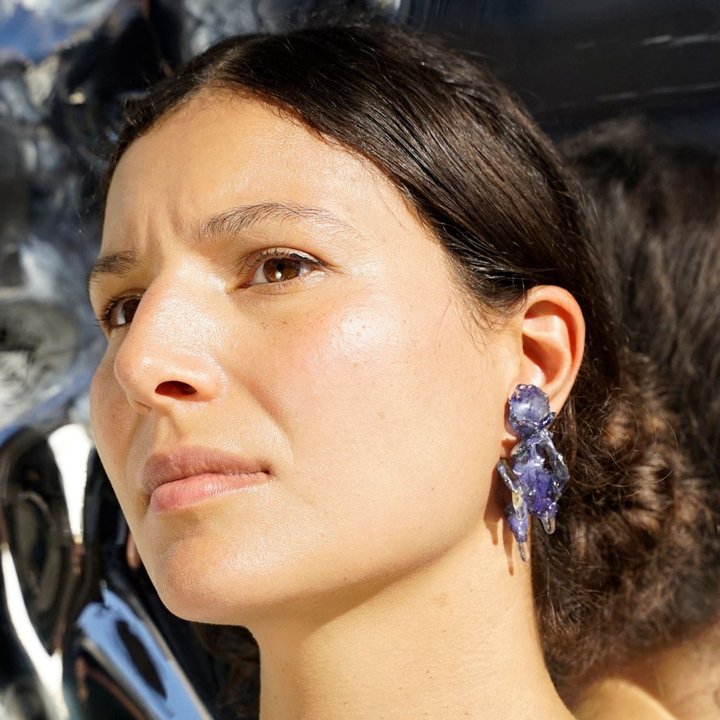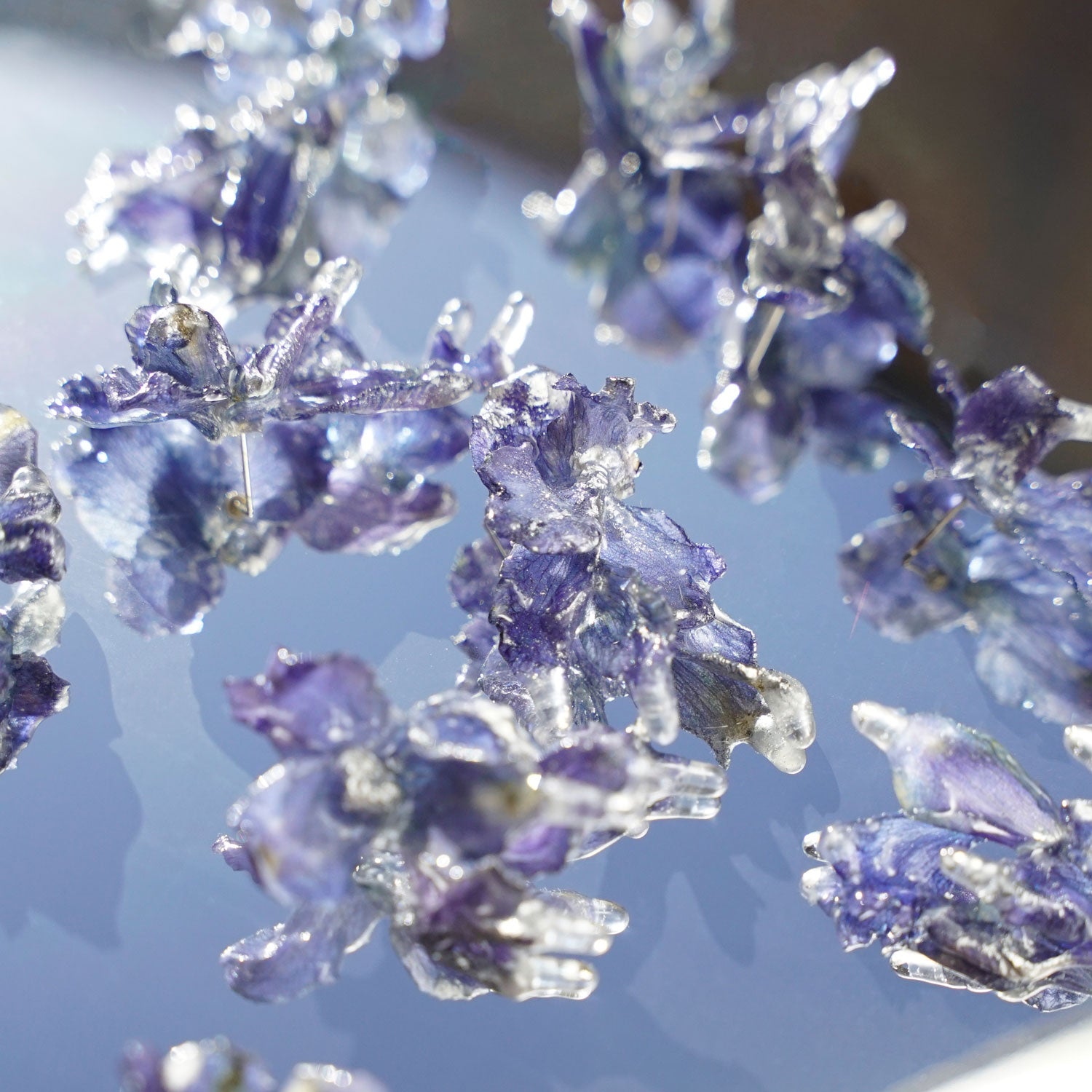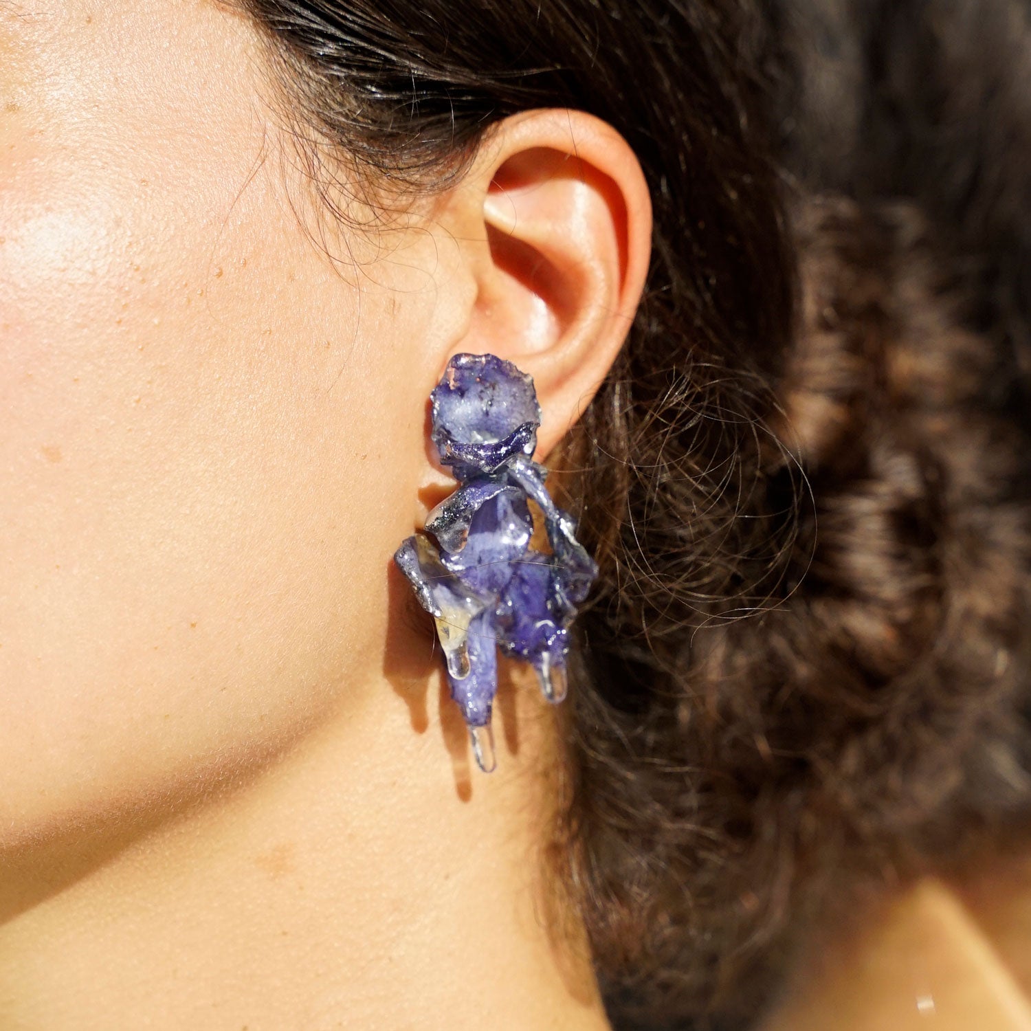 This unique floral jewellery piece feature real flower petals, dried and crafted into hybrid flowers by the designer. Encased in epoxy resin with pigments, each piece is a one-of-a-kind creation. The metal clips are made of brass with a thin layer of silver, ensuring durability and a refined look.