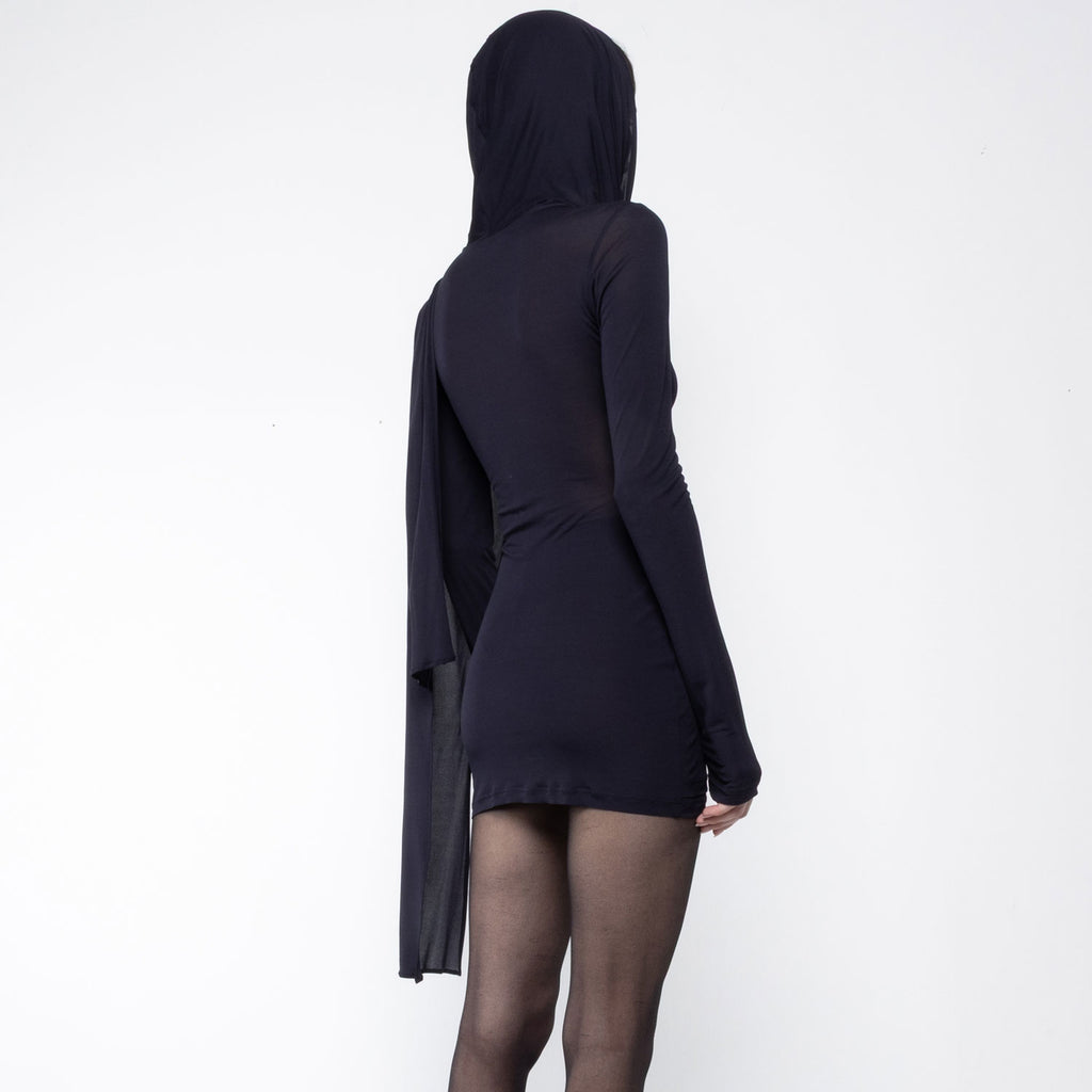 Long sleeved mini dress. With an additional head scarf attached at the neckline that can be wrapped in multiple ways.