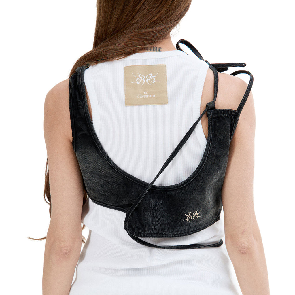 Laced denim top with metallic zip, washed denim, silver embroidery on the back.