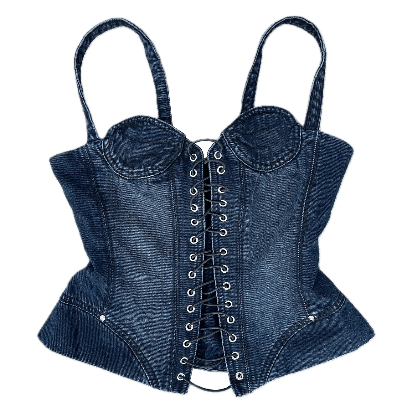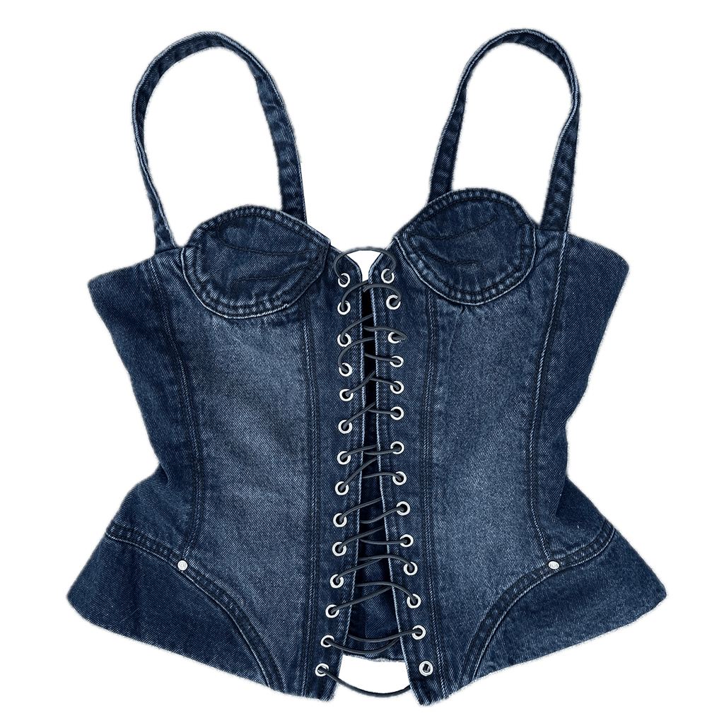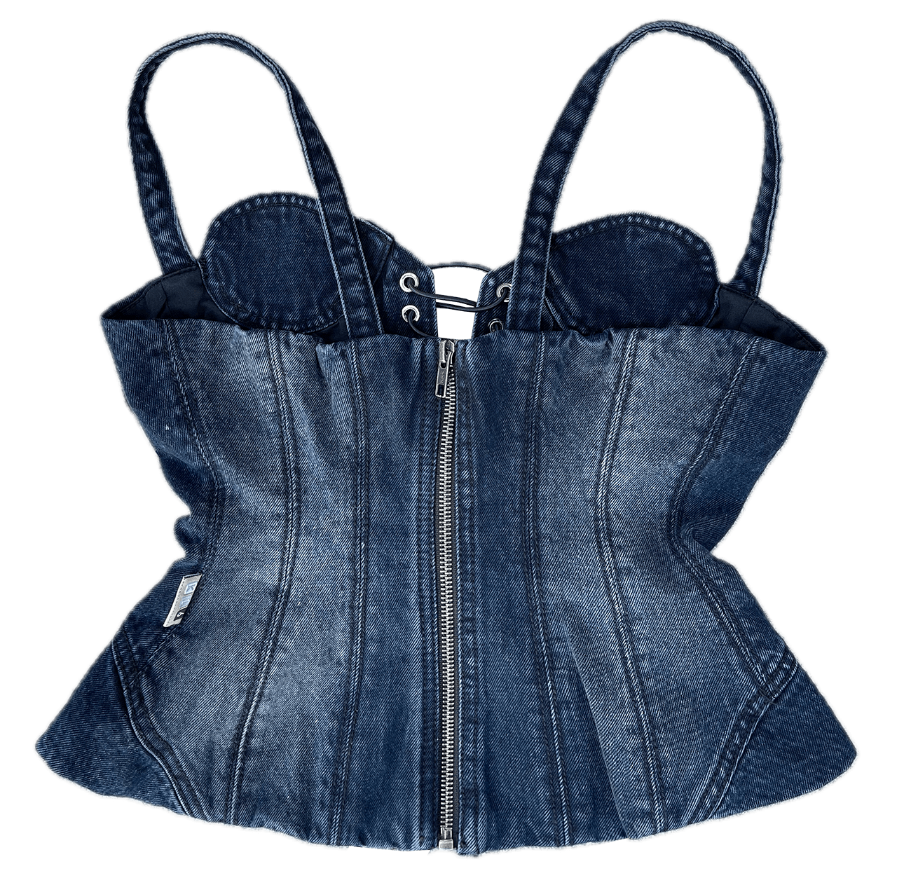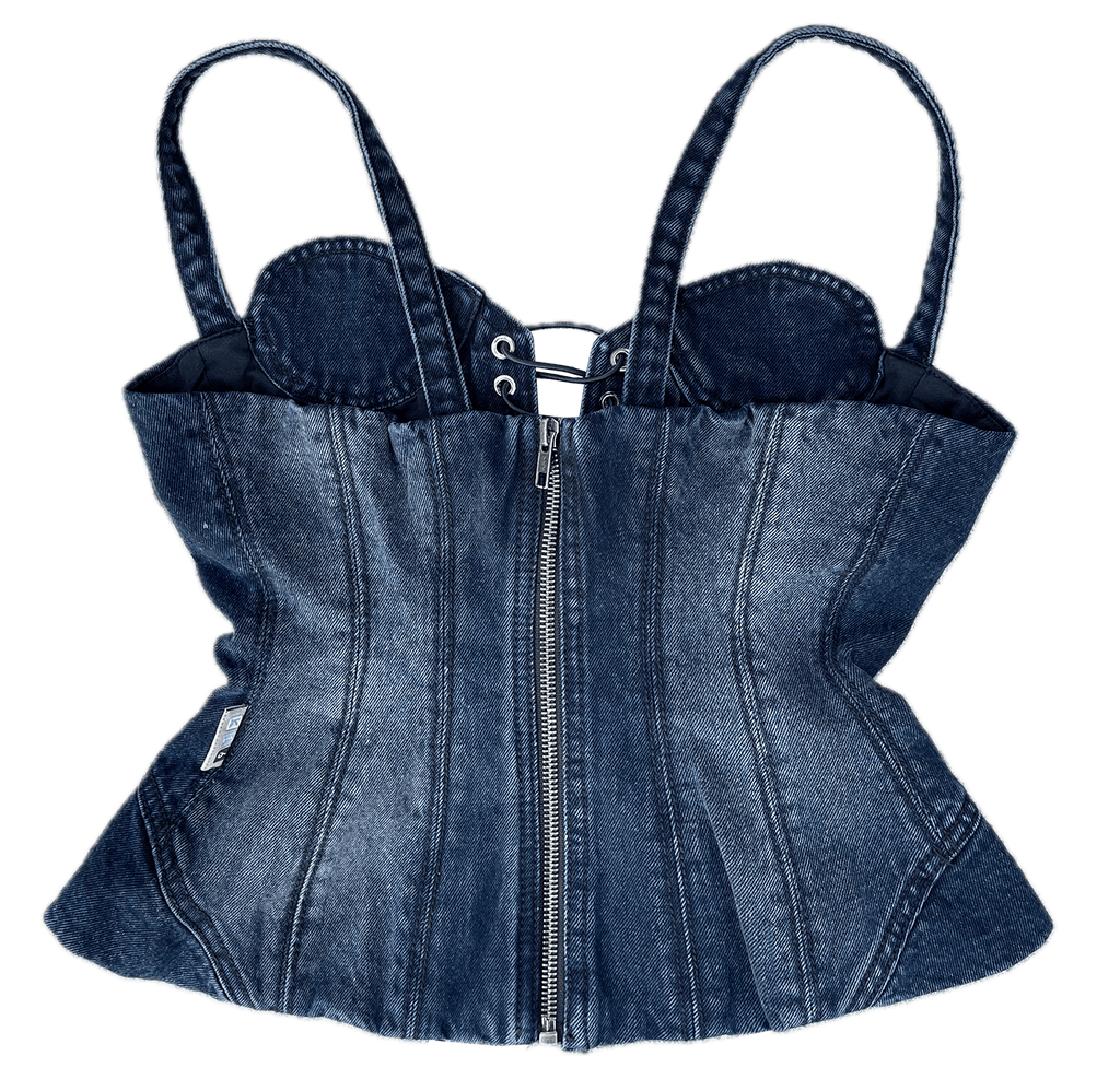 Tight fit denim corset with washed effect, metallic eyelets, zip on the back, cotton lining.
