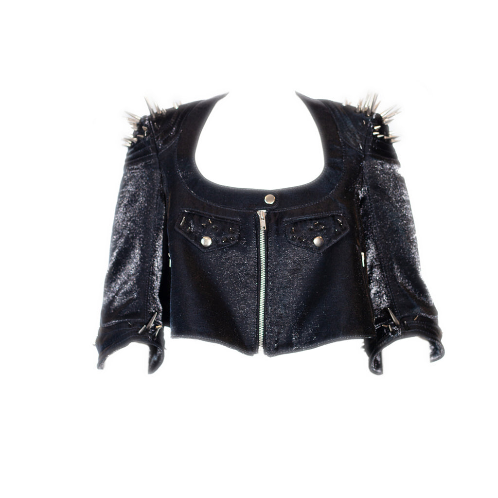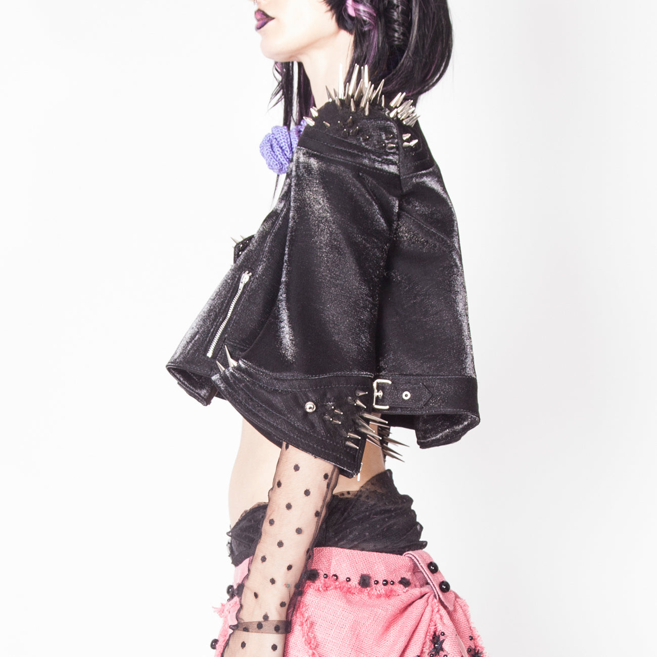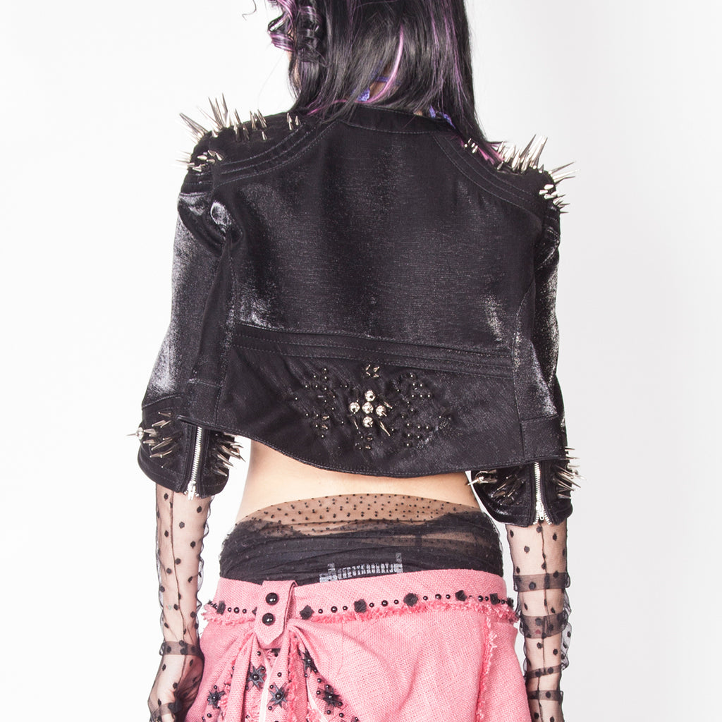 Cropped black jacket with metallic zipper, pockets, and button details, embellished with graphic spike studs motifs