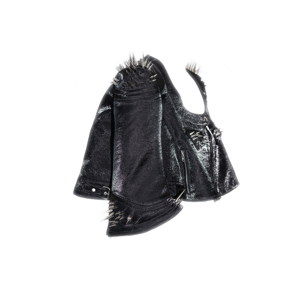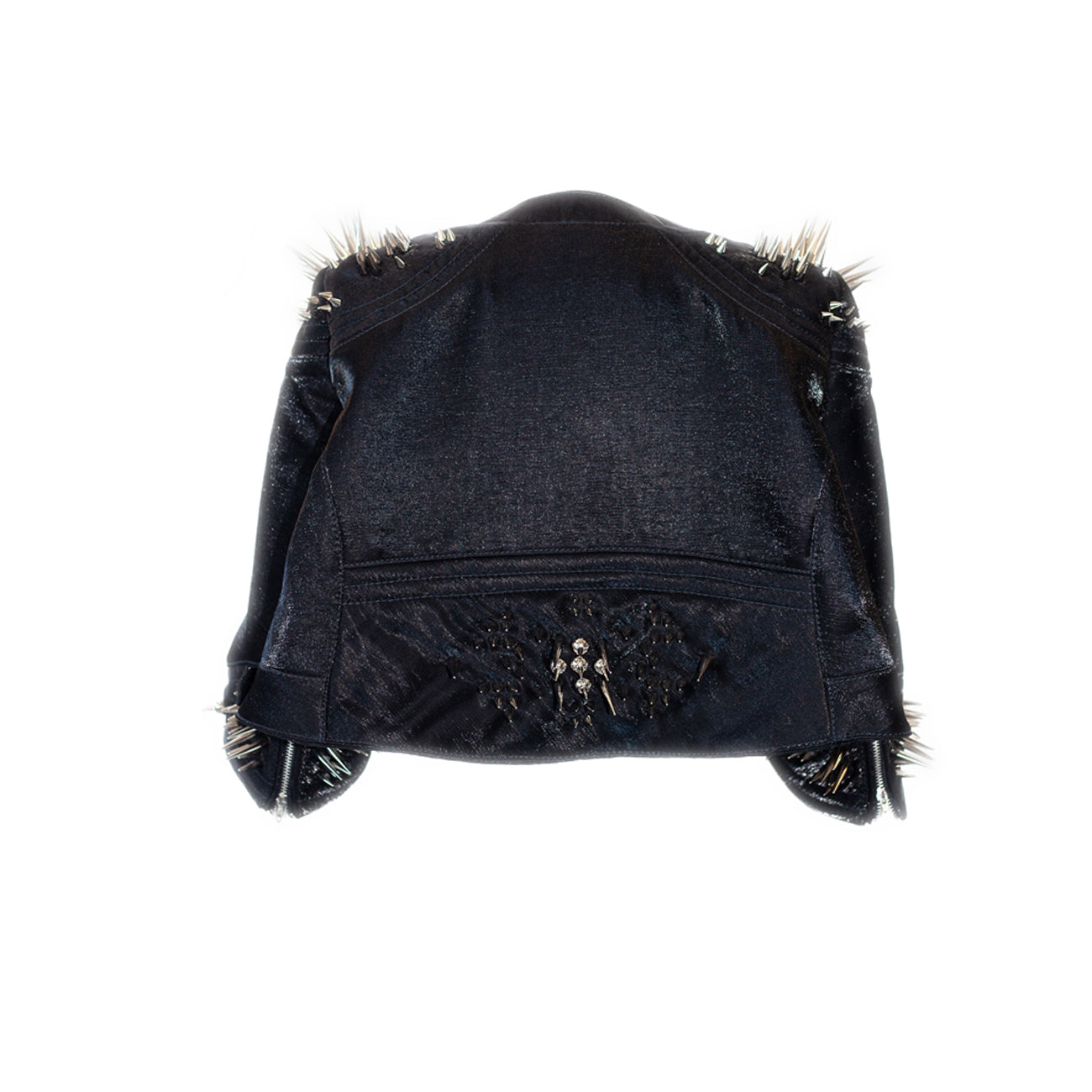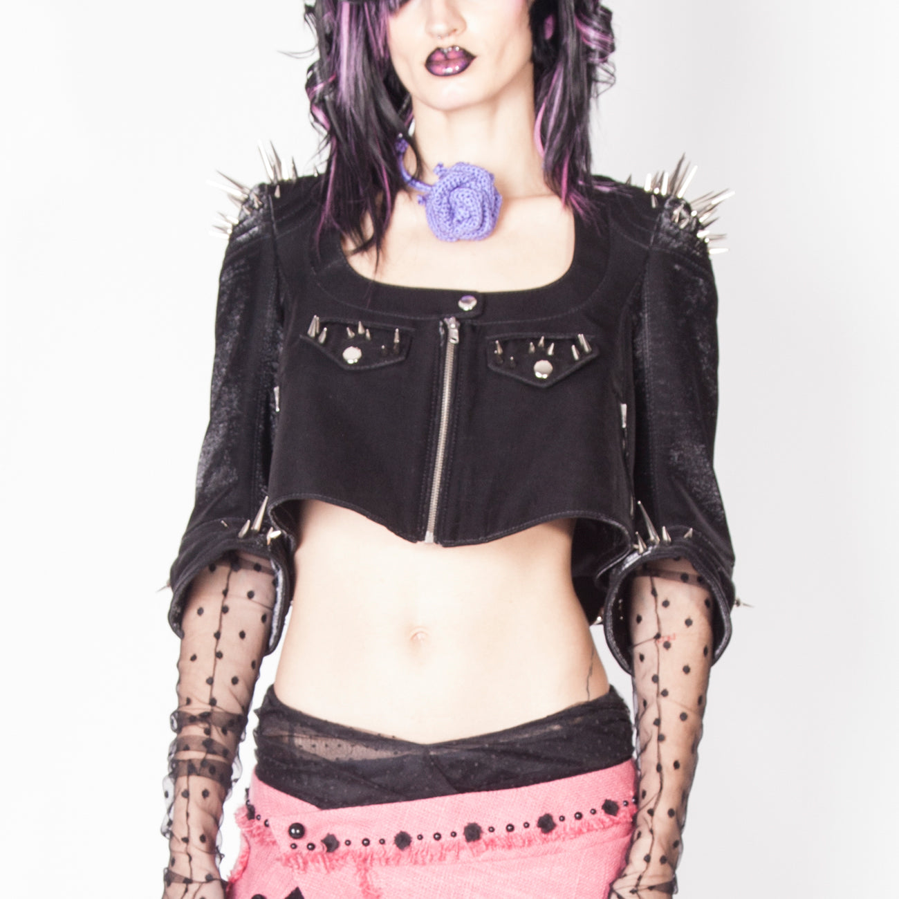 Cropped black jacket with metallic zipper, pockets, and button details, embellished with graphic spike studs motifs