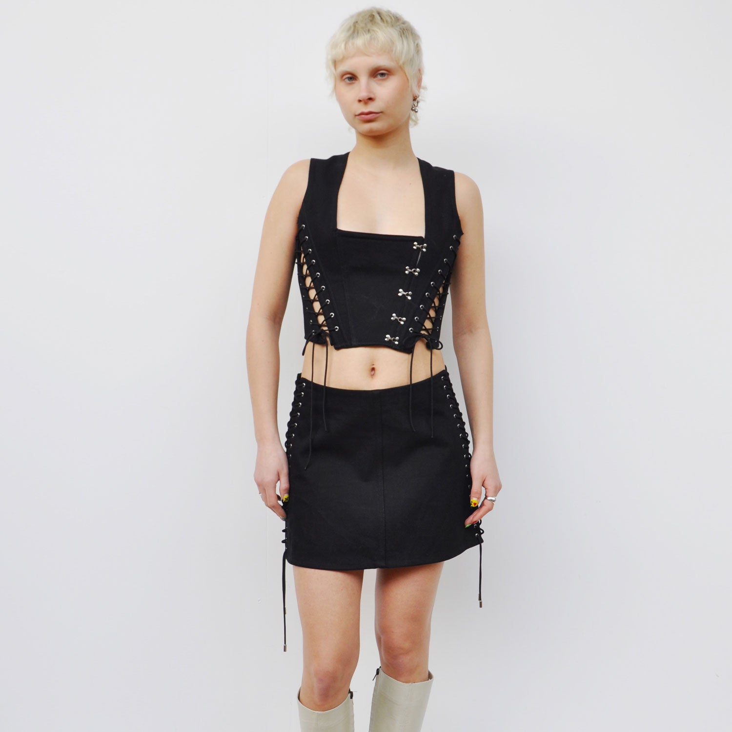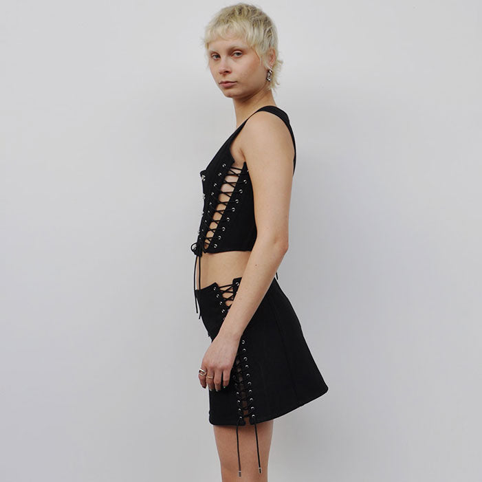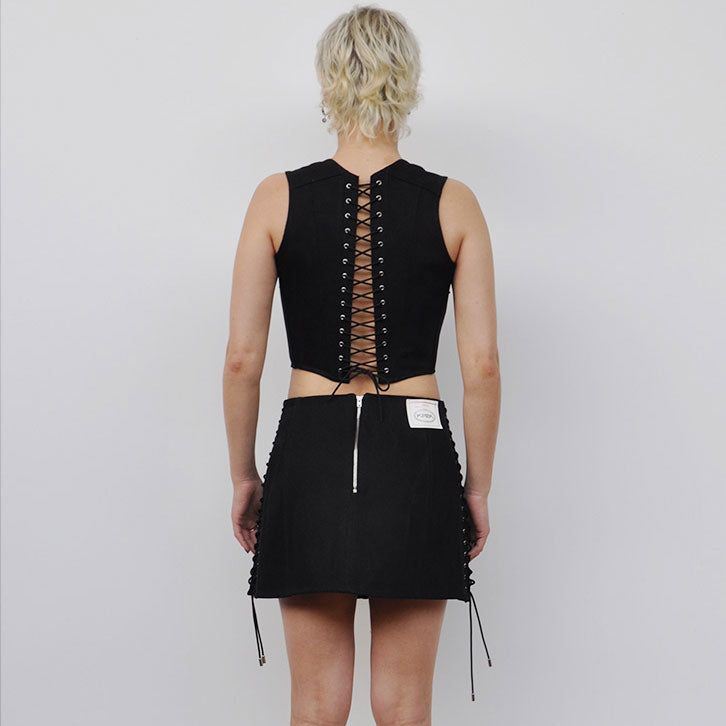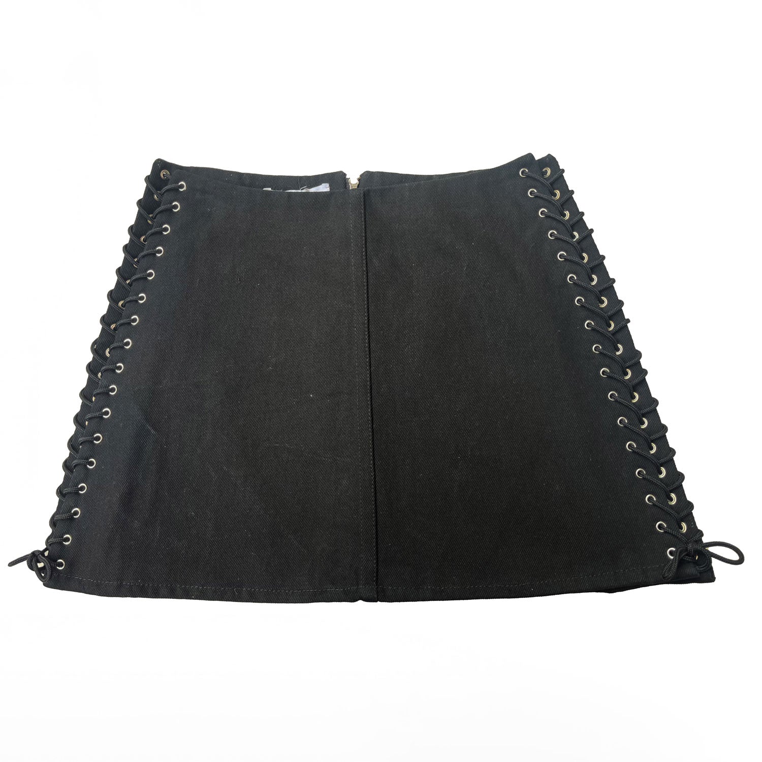 The mini skirt features adjustable lace-up sides, offering a hint of skin exposure.